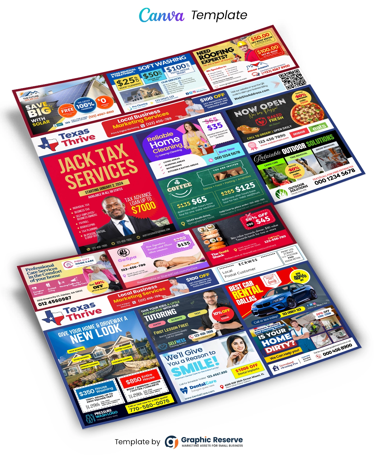 Promote multiple businesses with one powerful postcard! This 12×9 Co-Op EDDM Postcard Canva Template is designed specifically for shared-cost direct mail campaigns. Perfect for local marketing agencies, this template helps you offer premium advertising space to multiple clients on a single, oversized Every Door Direct Mail (EDDM) postcard.