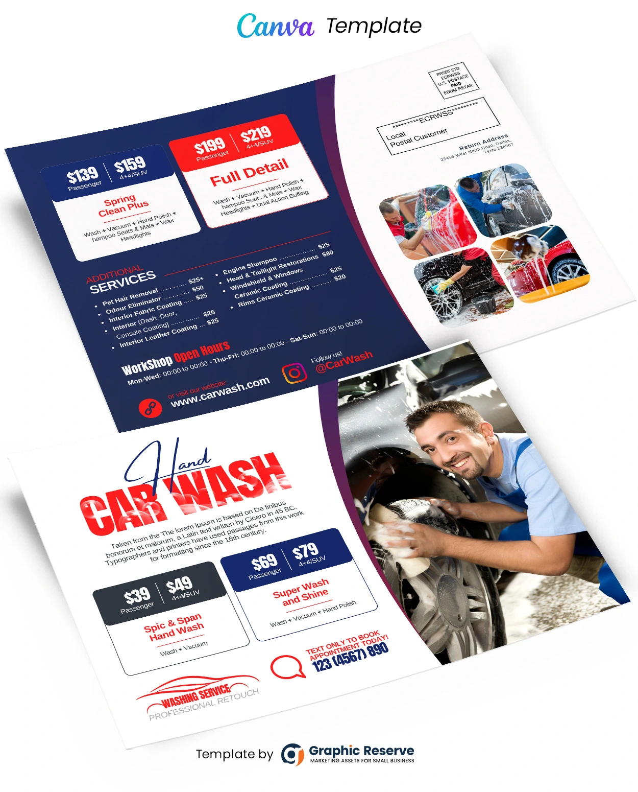 Design an effective Car Wash EDDM Mailer with our customizable Canva template. Perfect for promoting your car wash services, special offers, and seasonal discounts to a local audience. Create eye-catching, professional mailers that attract new customers and grow your business!