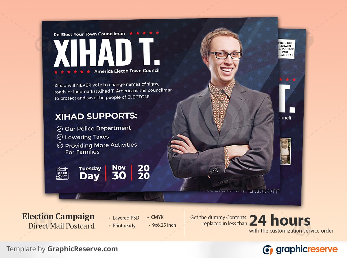 Election Campaign Political eddm Postcard Design Template is perfectly designed for Election campaigns, political movements, political events,s and much more. You can also use this template for various advertising purposes. Easily Editable for easy understanding. This Template is well organized and structured. Images, texts, and colors are fully editable. You can edit them quickly and easily. All political direct mail examples are very well organized proper Layer by name & groups. Image placeholders are Smart-Objects to make it easy for you to add images And edit files.
