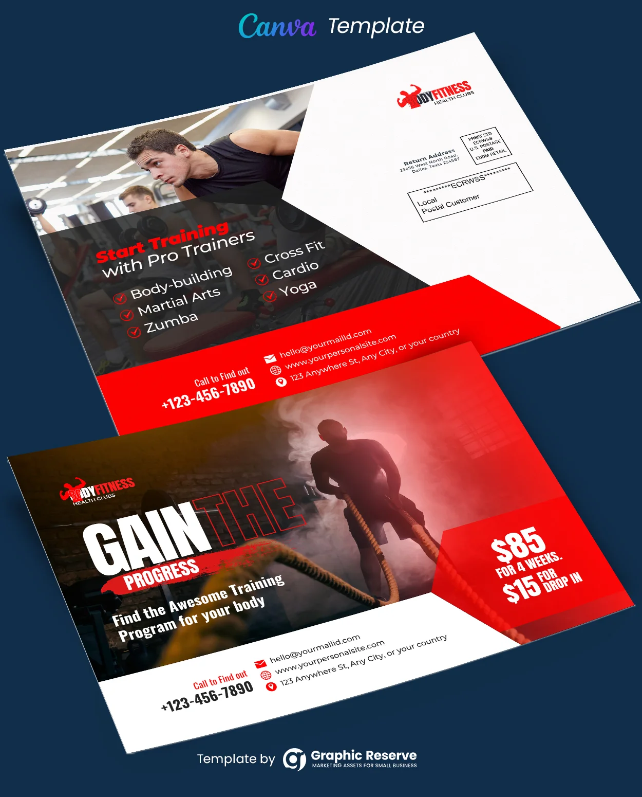 Gym Direct Mail EDDM Postcard Design Template. (gp4) This is a fitness & health eddm mailer. I would recommend this multipurpose postcard template for the marathon, club, party, health, fitness, bodybuilding, gym, training, sports club, dance studio, martial arts, yoga, boxing, and all other fitness-related businesses. This template is in fully online editable canva files, All elements are easily editable and customizable.