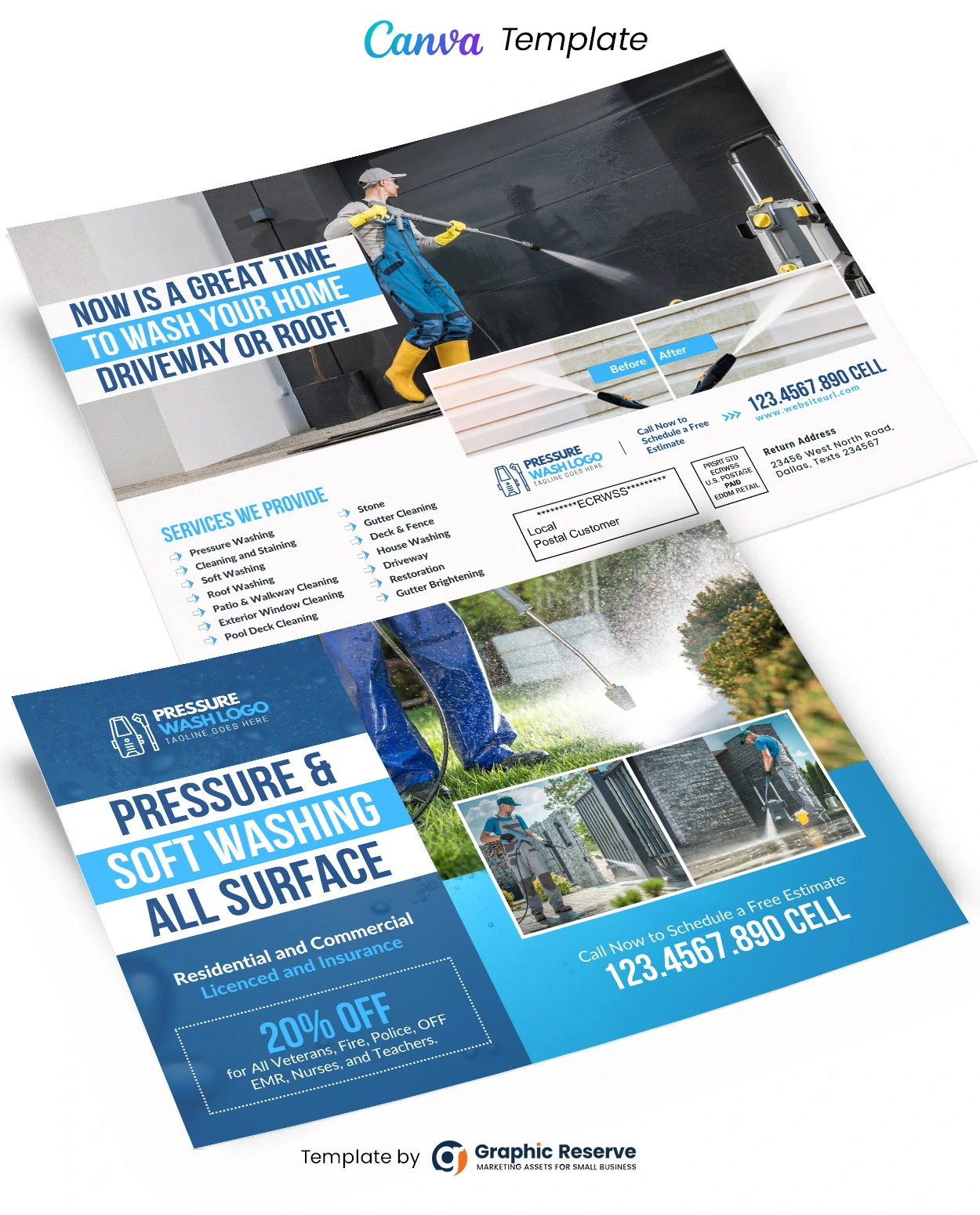 Pressure Washing Mailer Postcard Canva template This postcard template is specially designed for Cleaning and Washing Services, You can definitely use this template for any other Services if you want. Fully editable, image/logo can be quickly added or replaced in Canva